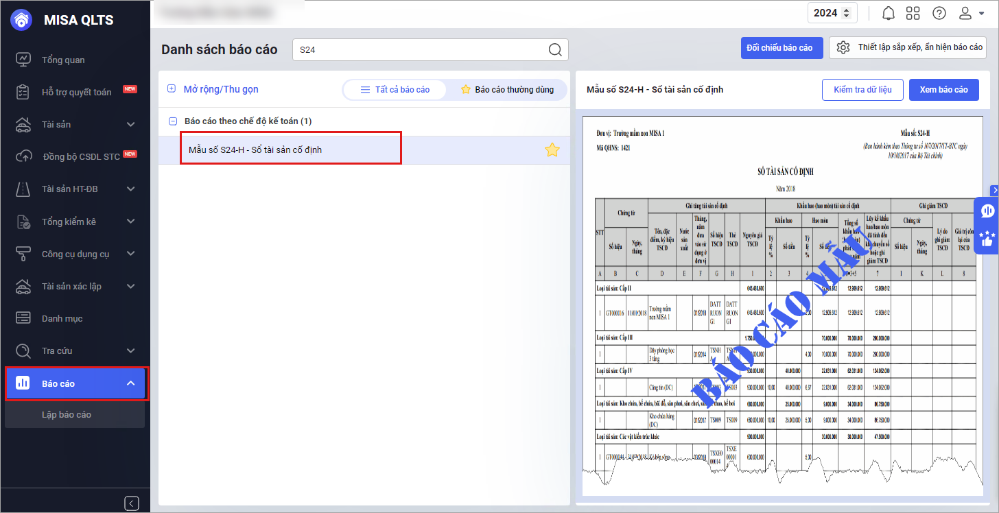 Bước 1: Vào menu Báo cáo\Báo cáo theo chế độ kế toán\ chọn mẫu số S24-H – Sổ tài sản cố định