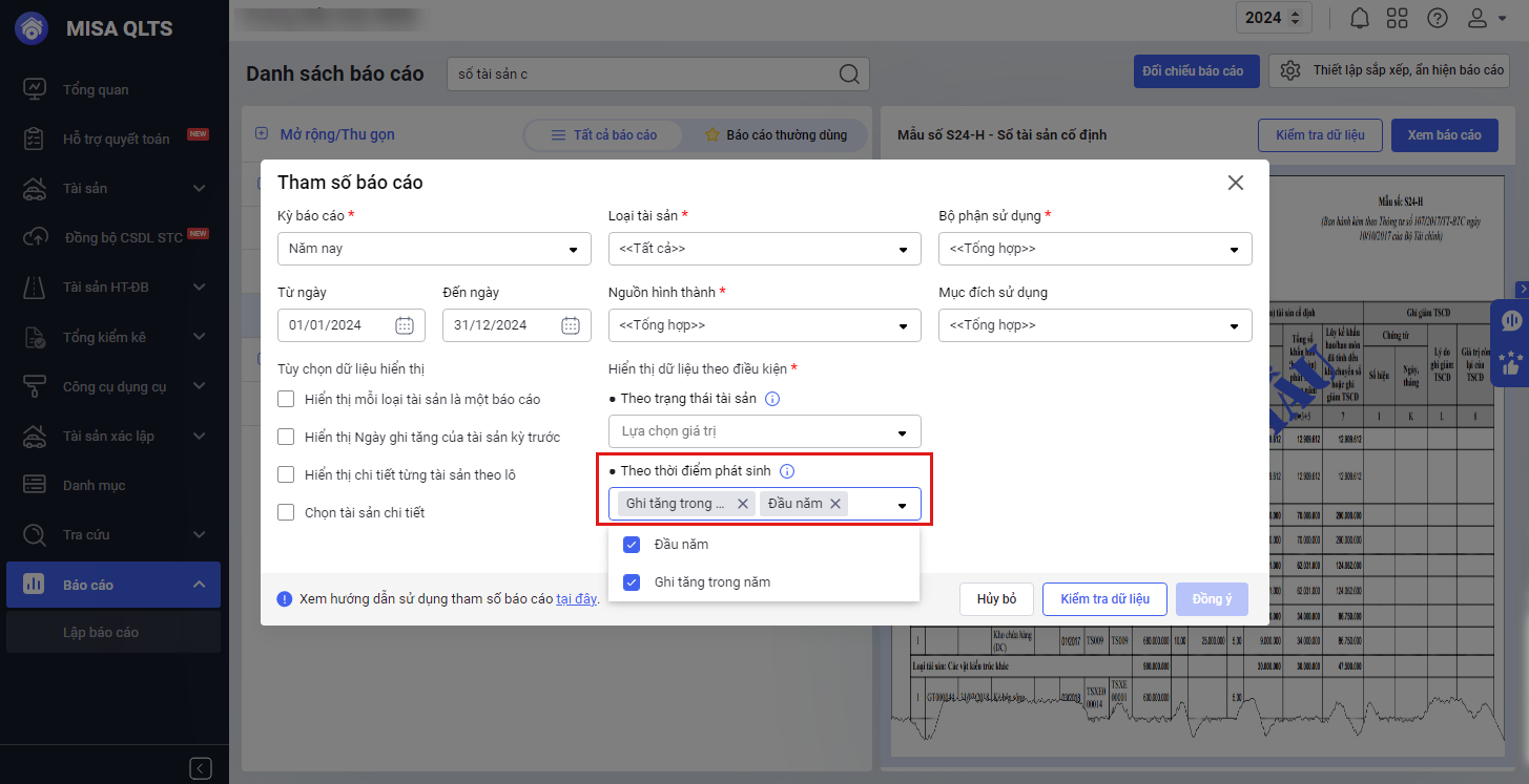 • Khi in Sổ tài sản S24-H, tại phần tham số lọc theo tình trạng tài sản, anh/chị đang tích chọn cả trạng thái “Đã ghi giảm”, nên báo cáo vẫn hiển thị các tài sản đã ghi giảm trong năm để phục vụ đối chiếu lịch sử.