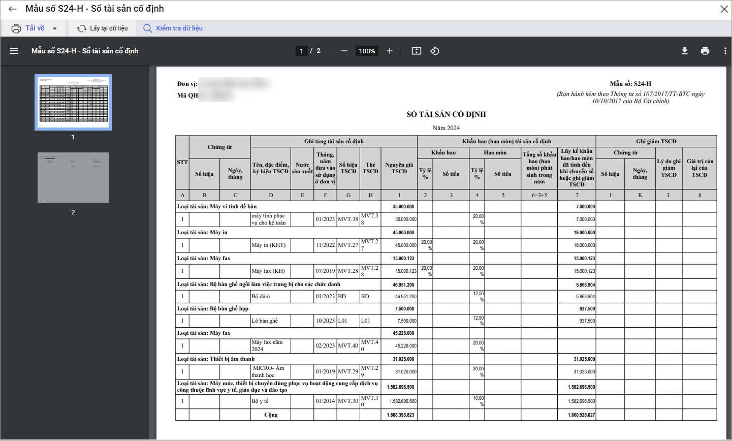 • Mẫu số S24-H – Sổ tài sản cố định là mẫu theo Thông tư quy định, chỉ hiển thị các thông tin cơ bản như: nguyên giá, khấu hao, hao mòn… theo từng phòng ban/bộ phận sử dụng.