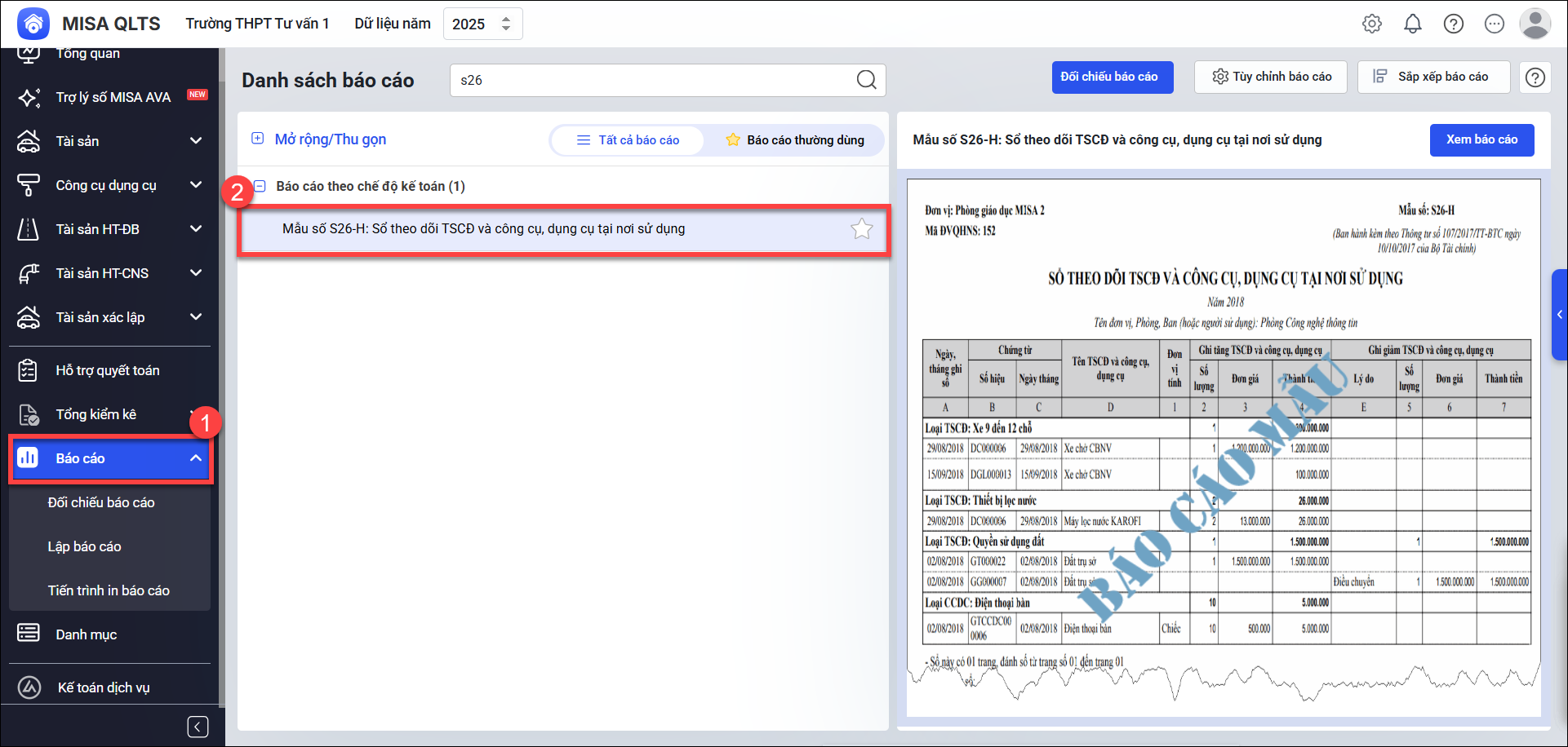 4.1. Khi in Mẫu số (báo cáo, biểu) S26-H, Mẫu số (báo cáo, biểu) S26, anh/chị có thể gặp trường hợp “Thiếu số liệu tài sản hoặc công cụ dụng cụ trên báo cáo”: