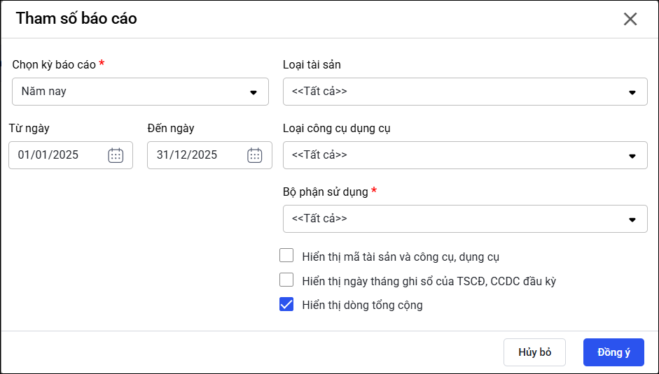 Bộ phận sử dụng: Chọn bộ phận sử dụng tài sản/CCDC hoặc để “Tất cả” nếu muốn hiển thị toàn đơn vị.