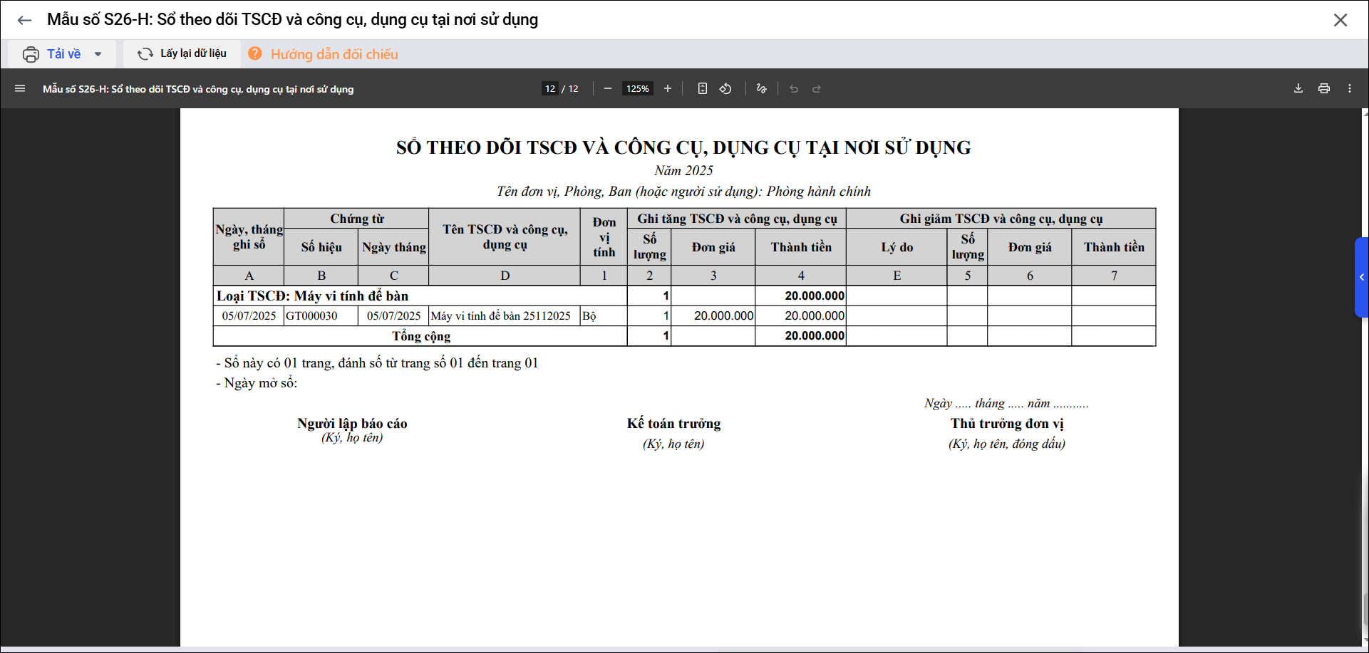 Bài viết này giúp Anh/chị in được báo cáo Mẫu số S26-H: Sổ theo dõi TSCĐ và công cụ, dụng cụ tại nơi sử dụng (S26).