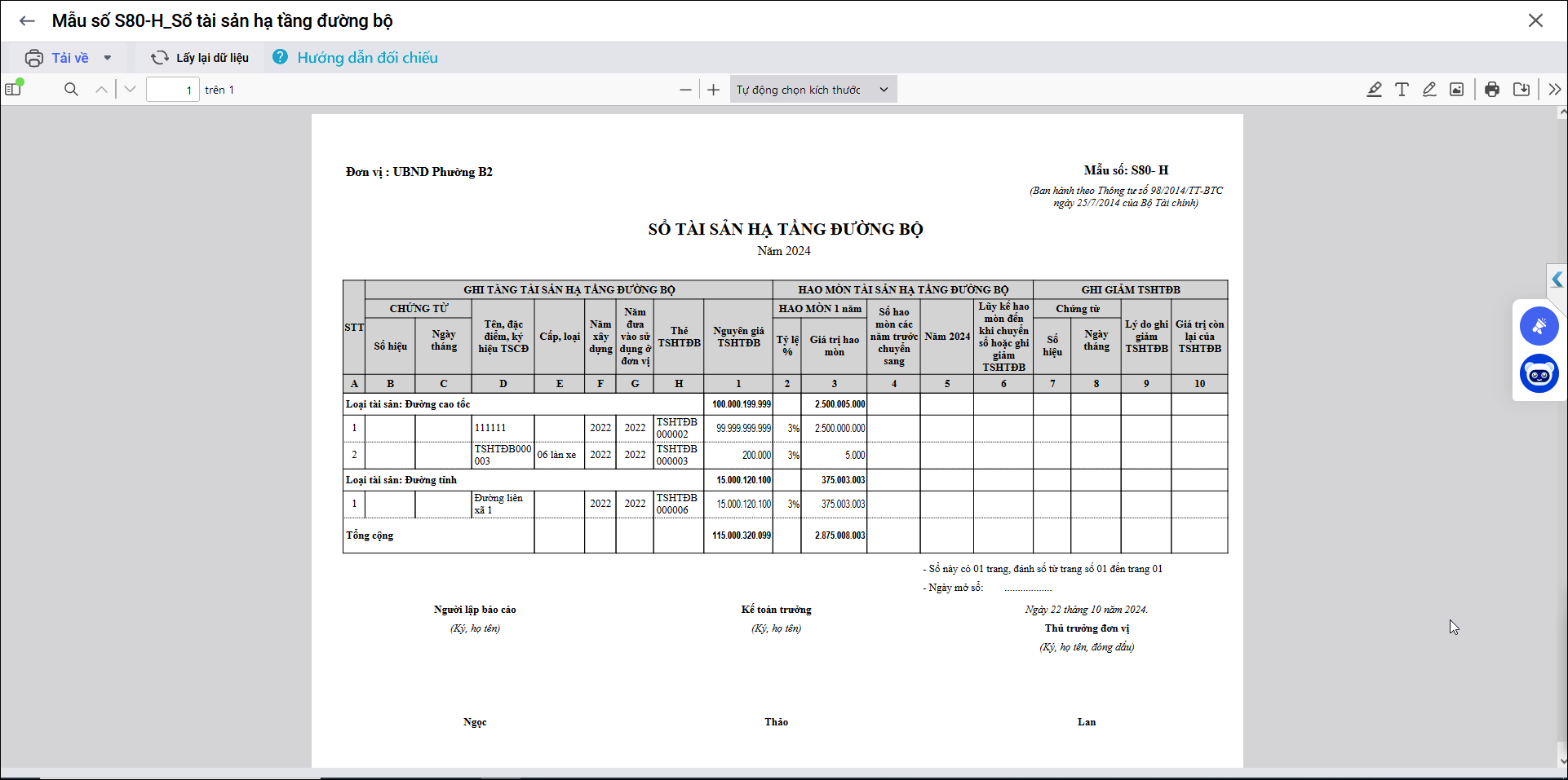 Bài viết này giúp Anh/chị in được Mẫu số S80-H – Sổ tài sản hạ tầng đường bộ.