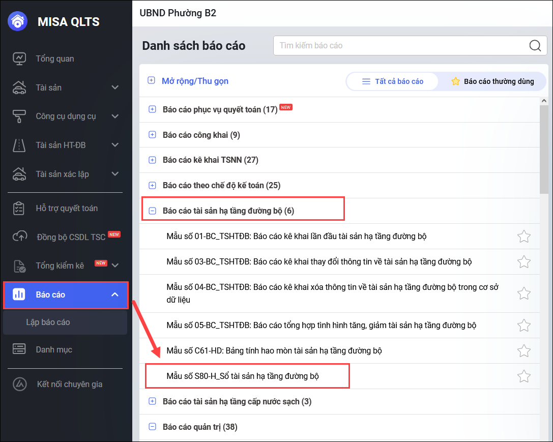 Bước 1: Vào menu Báo cáo\Báo cáo tài sản hạ tầng đường bộ\chọn Mẫu số S80-H – Sổ tài sản hạ tầng đường bộ.