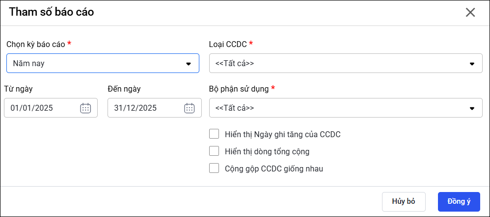 - Cộng gộp CCDC giống nhau: Tích chọn nếu muốn cộng gộp CCDC giống nhau