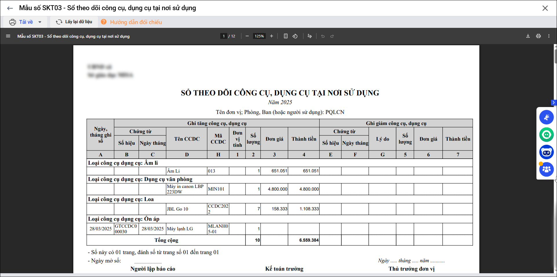 Bài viết này giúp anh/chị in được Mẫu số SKT03 – Sổ theo dõi công cụ, dụng cụ tại nơi sử dụng, giúp quản lý và theo dõi số lượng CCDC tại đơn vị.