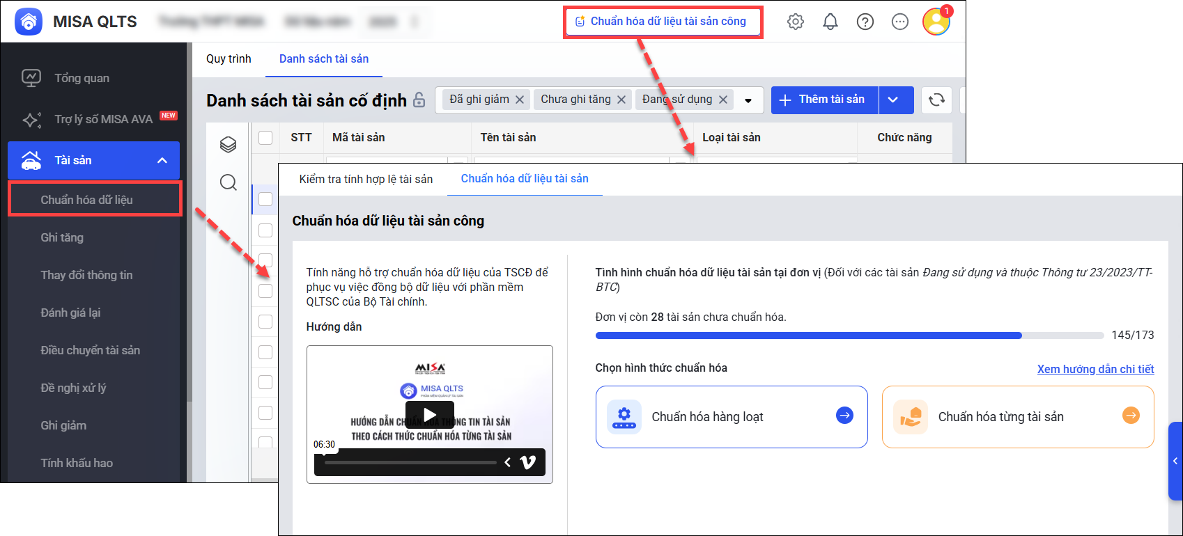 - Anh/chị chọn tính năng Chuẩn hóa dữ liệu tài sản công hoặc vào menu Tài sản\Chuẩn hóa dữ liệu để tiến hành chuẩn hóa dữ liệu cho tài sản. Xem hướng dẫn chi tiết tại đây.