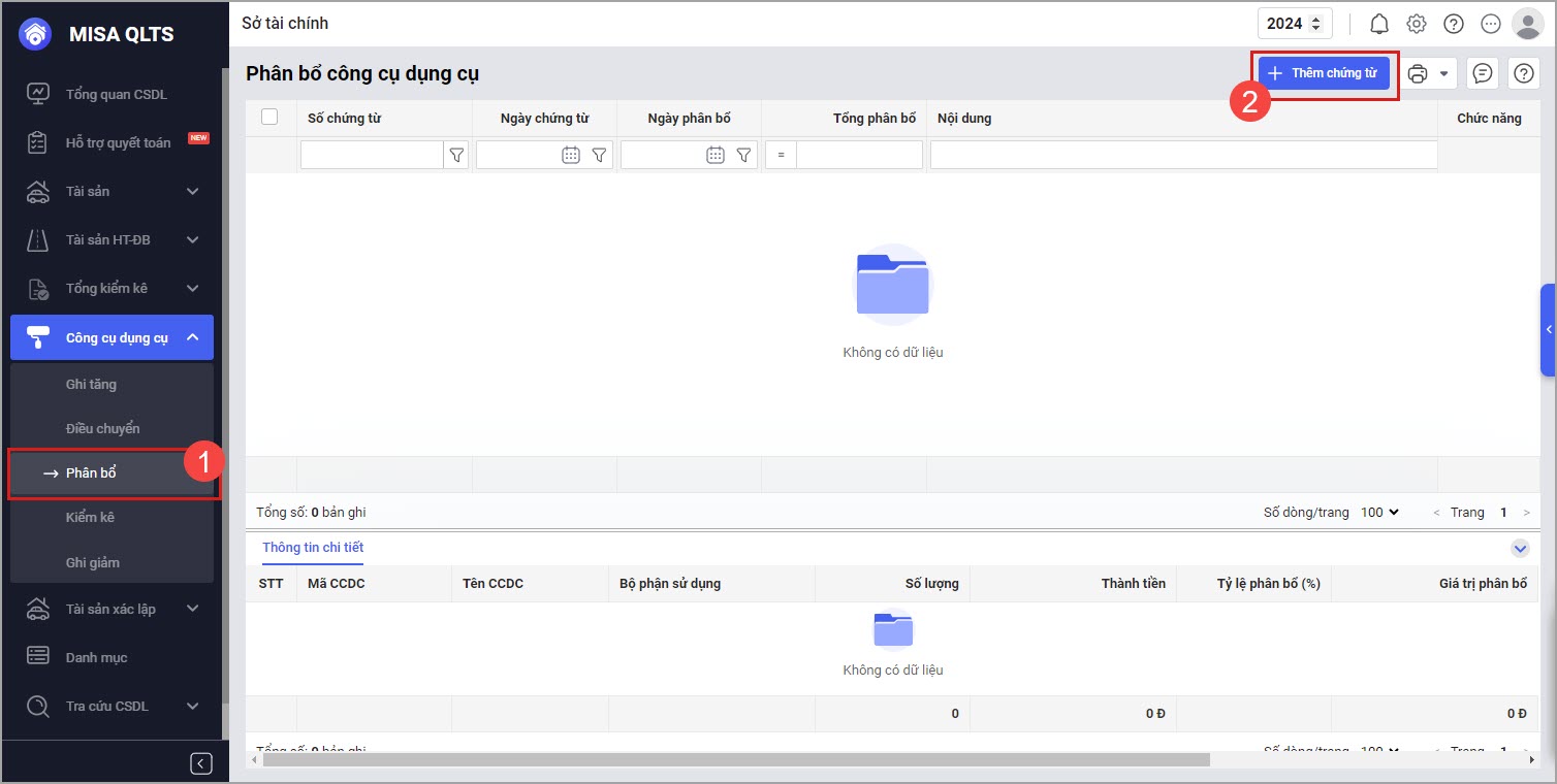 Bước 1: Vào Công cụ dụng cụ\Phân bổ. Nhấn Thêm chứng từ.