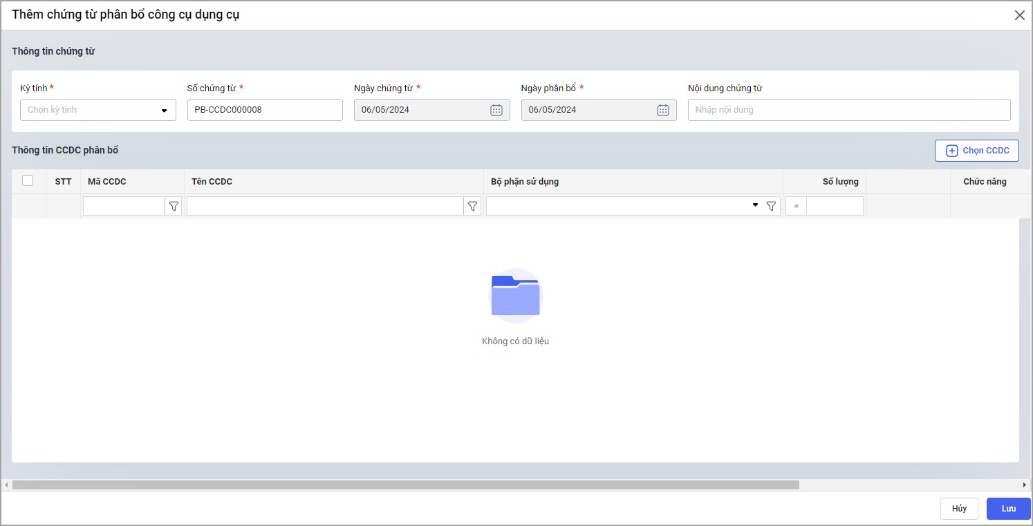 Bước 2: Khai báo thông tin trên chứng từ phân bổ công cụ dụng cụ: