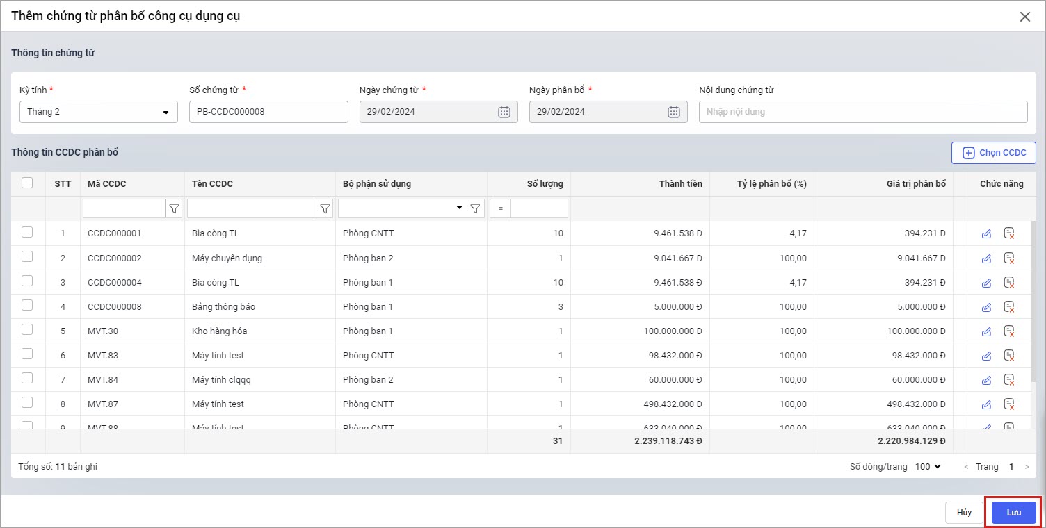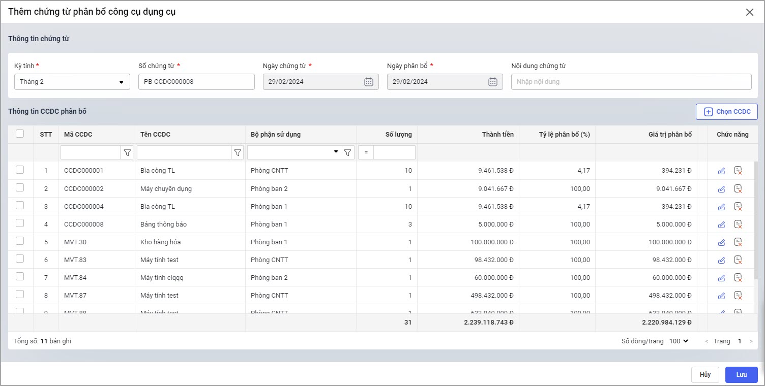 - Tùy theo kỳ phân bổ, phần mềm sẽ tự động thống kê danh sách các công cụ dụng cụ có kỳ phân bổ tương ứng.
