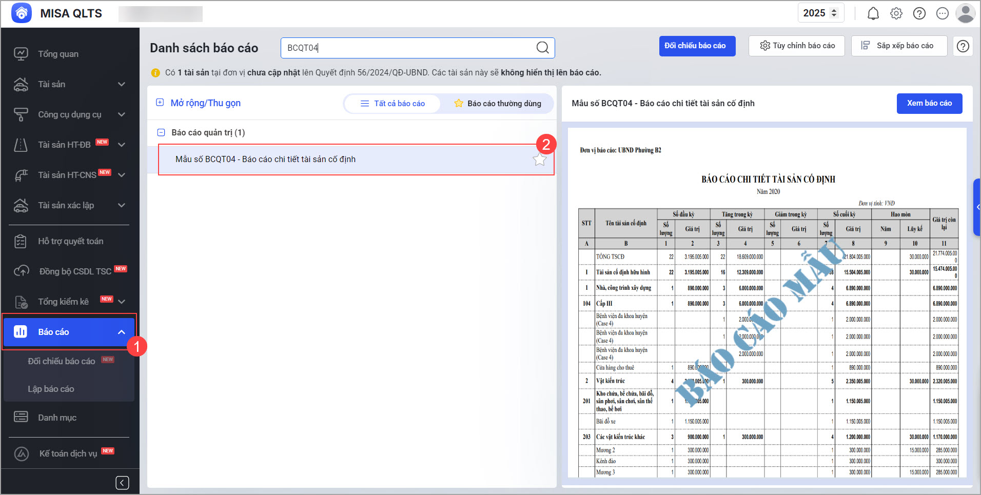 Bước 1: Vào menu Báo cáo\Báo cáo quản trị\ chọn Mẫu số BCQT04 – Báo cáo chi tiết tài sản cố định.