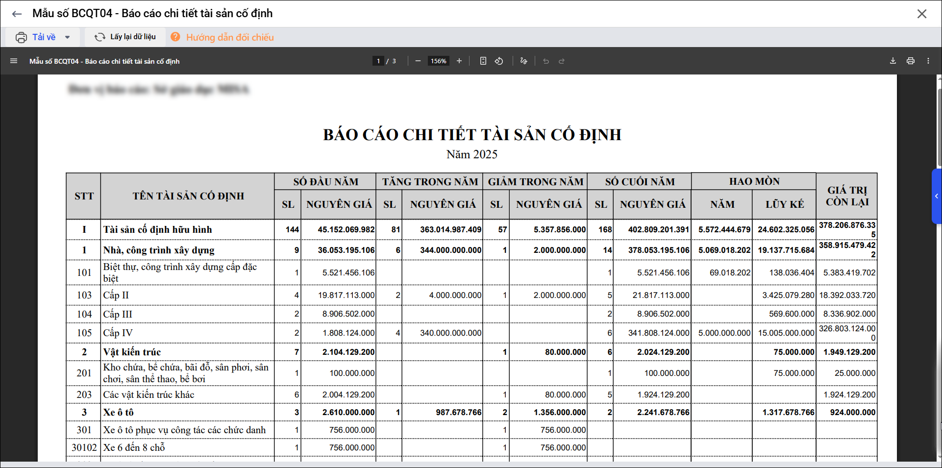 Báo cáo Chi tiết tài sản cố định (Mẫu số BCQT04) giúp anh/chị theo dõi đầy đủ tình hình biến động tài sản cố định trong năm, bao gồm: