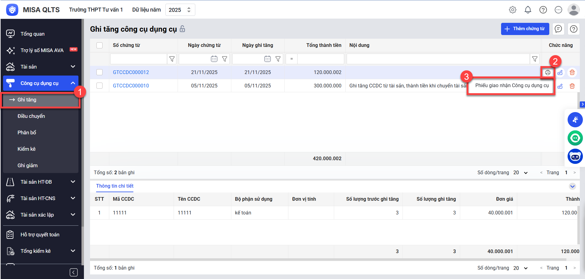 Bước 2: Tại màn hình ghi tăng CCDC, chọn chứng từ cần in Phiếu giao nhận công cụ dụng cụ, sau đó nhấn vào biểu tượng In và chọn Phiếu giao nhận công cụ dụng cụ.