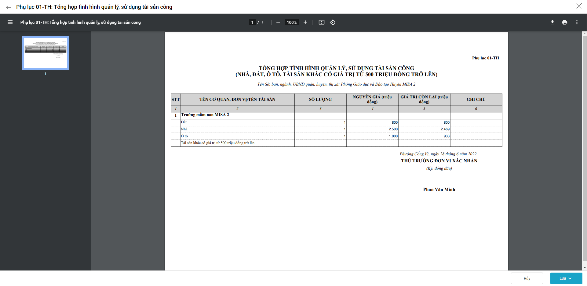 Bài viết này giúp anh/chị nắm được cập nhật cho phép in Phụ lục 01-TH: Tổng hợp tình hình quản lý, sử dụng tài sản công trên phần mềm iGOV Tài sản, phục vụ công tác báo cáo cho ban lãnh đạo và quản lý tài sản công theo quy định.