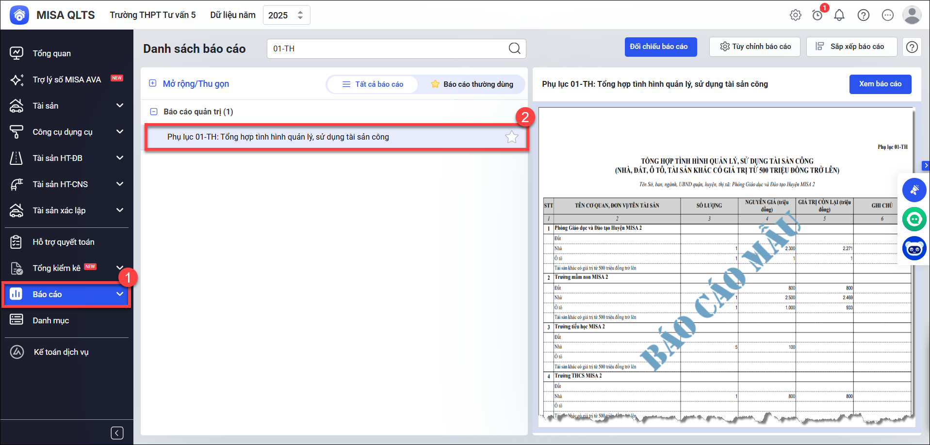 Bước 1: Vào menu Báo cáo\Báo cáo quản trị. Tại đây phần mềm đã bổ sung Phụ lục 01-TH: Tổng hợp tình hình quản lý, sử dụng tài sản công.