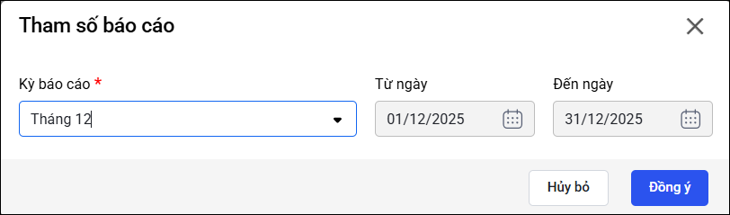 - Ô tham số Kỳ báo cáo hỗ trợ nhiều lựa chọn: chọn nhanh theo tháng, quý, năm hoặc tự xác định kỳ báo cáo bằng cách nhập “Từ ngày – Đến ngày”.