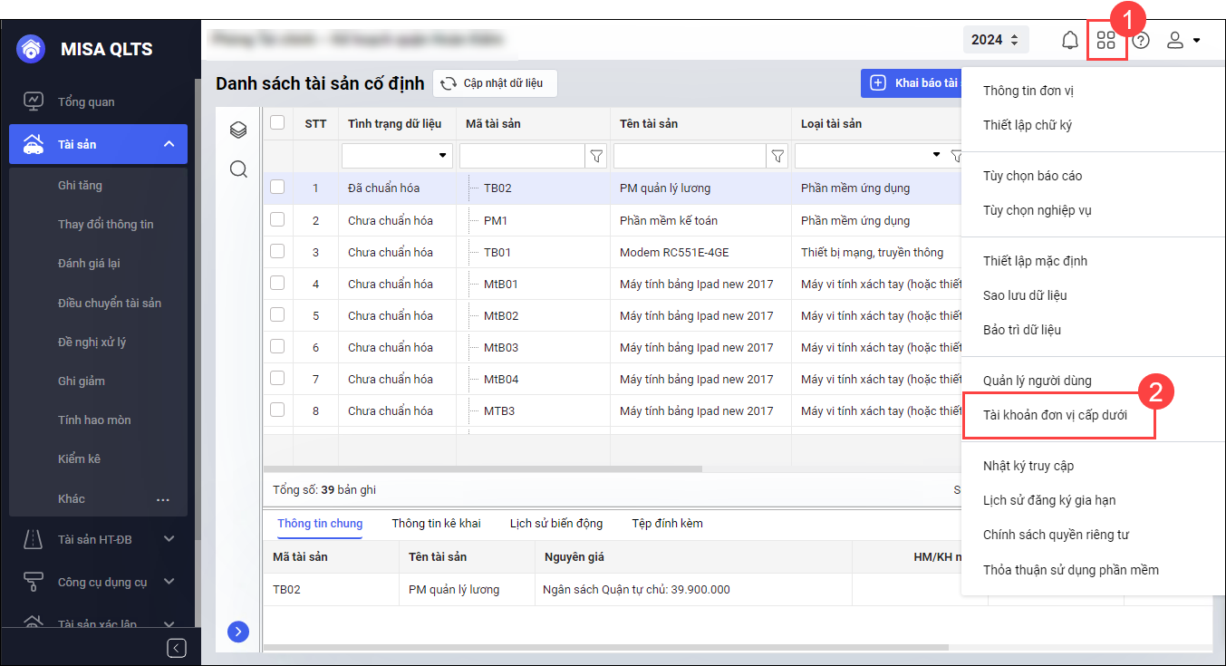 - Phần mềm lấy lên danh sách các đơn vị cấp dưới, anh/chị nhấn chọn để theo dõi, điều chỉnh tài khoản đang sử dụng MISA QLTS của đơn vị đó.
