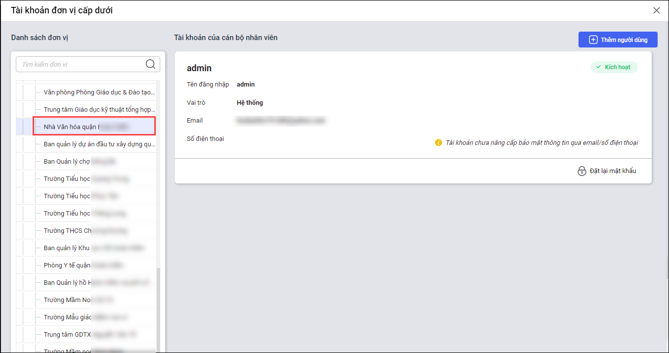 - Mỗi đơn vị đã mặc định một tài khoản admin có vai trò Hệ thống chung. Để tạo thêm tài khoản cho những người dùng khác tại đơn vị, chọn Thêm người dùng.