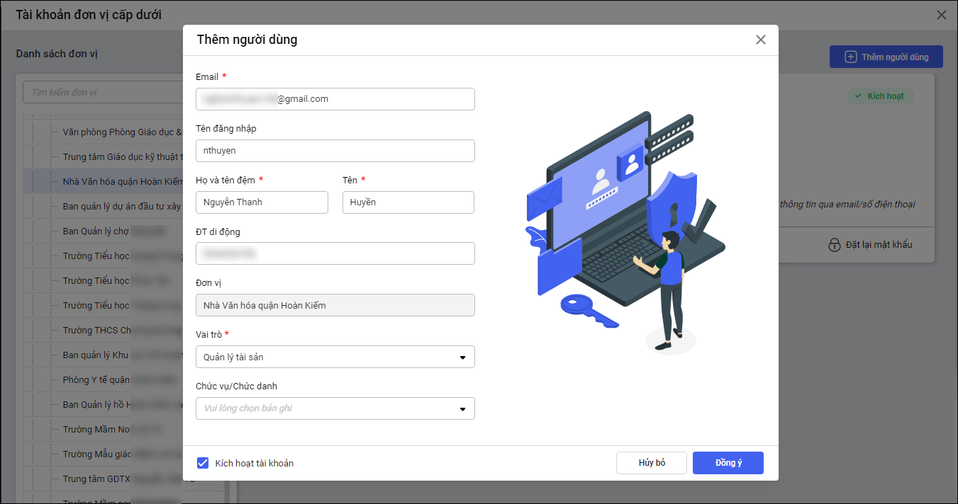 - Khai báo thông tin người dùng. Nhấn Đồng ý. (Lưu ý: Tích chọn Kích hoạt tài khoản để phần mềm tự động thêm và kích hoạt tài khoản mới cho người dùng)