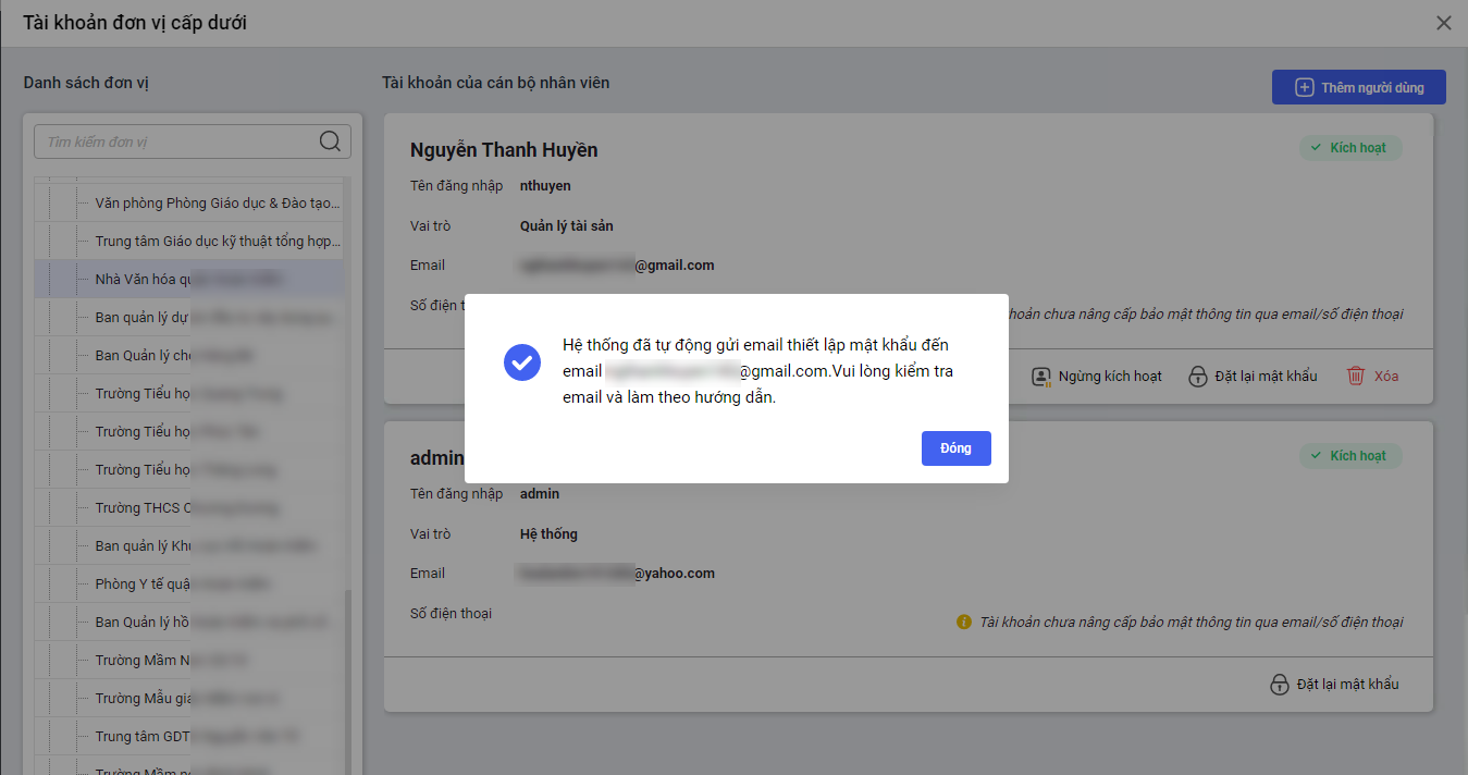 - Phần mềm tự động cập nhật mật khẩu mới, anh/chị thông báo cho người dùng kiểm tra email hoặc đăng nhập theo mật khẩu mới.