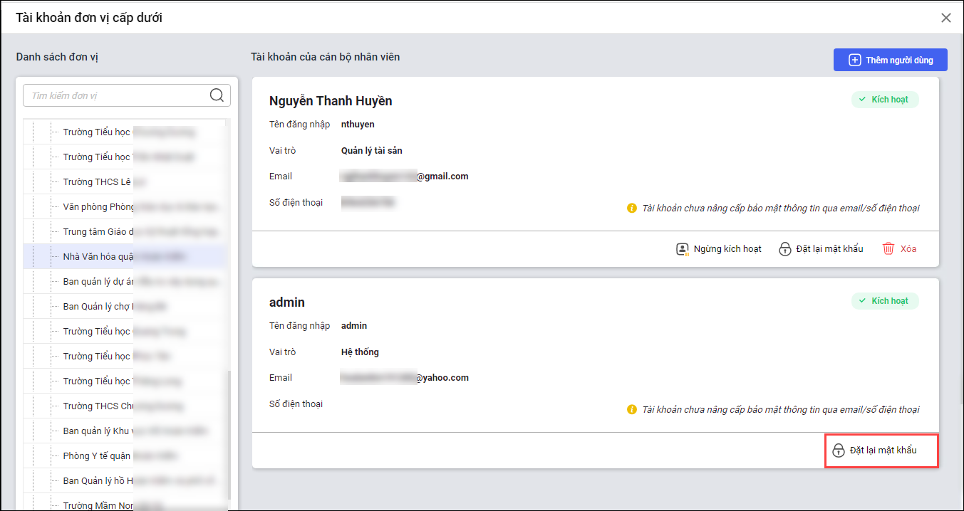 Nội dung bài viết gồm: Đơn vị chủ quản có thể xem danh sách tài khoản, thêm mới người dùng, kích hoạt/ngừng kích hoạt, đặt lại mật khẩu hoặc xóa tài khoản (trừ tài khoản admin hệ thống chỉ được đặt lại mật khẩu).