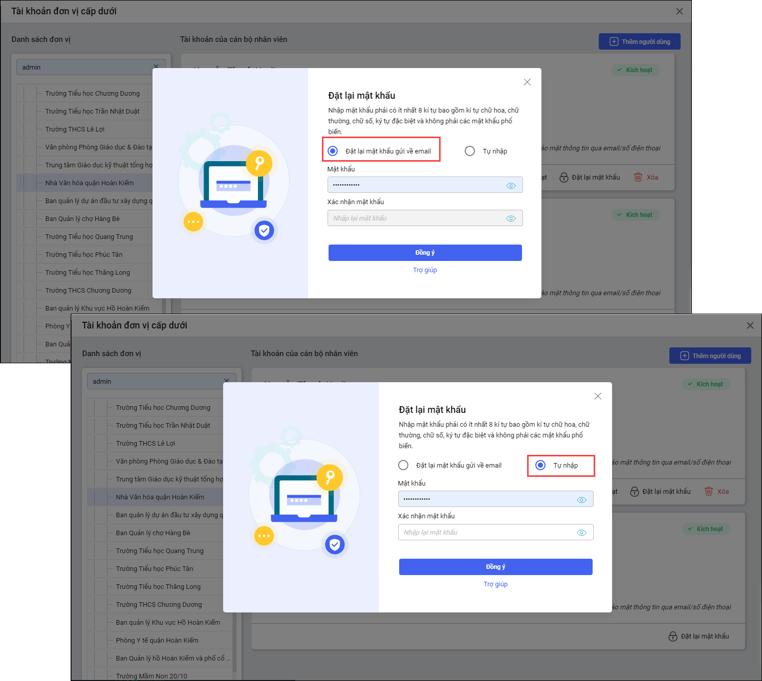 - Lựa chọn Đặt lại mật khẩu gửi về email hoặc Tự nhập để đặt lại mật khẩu.