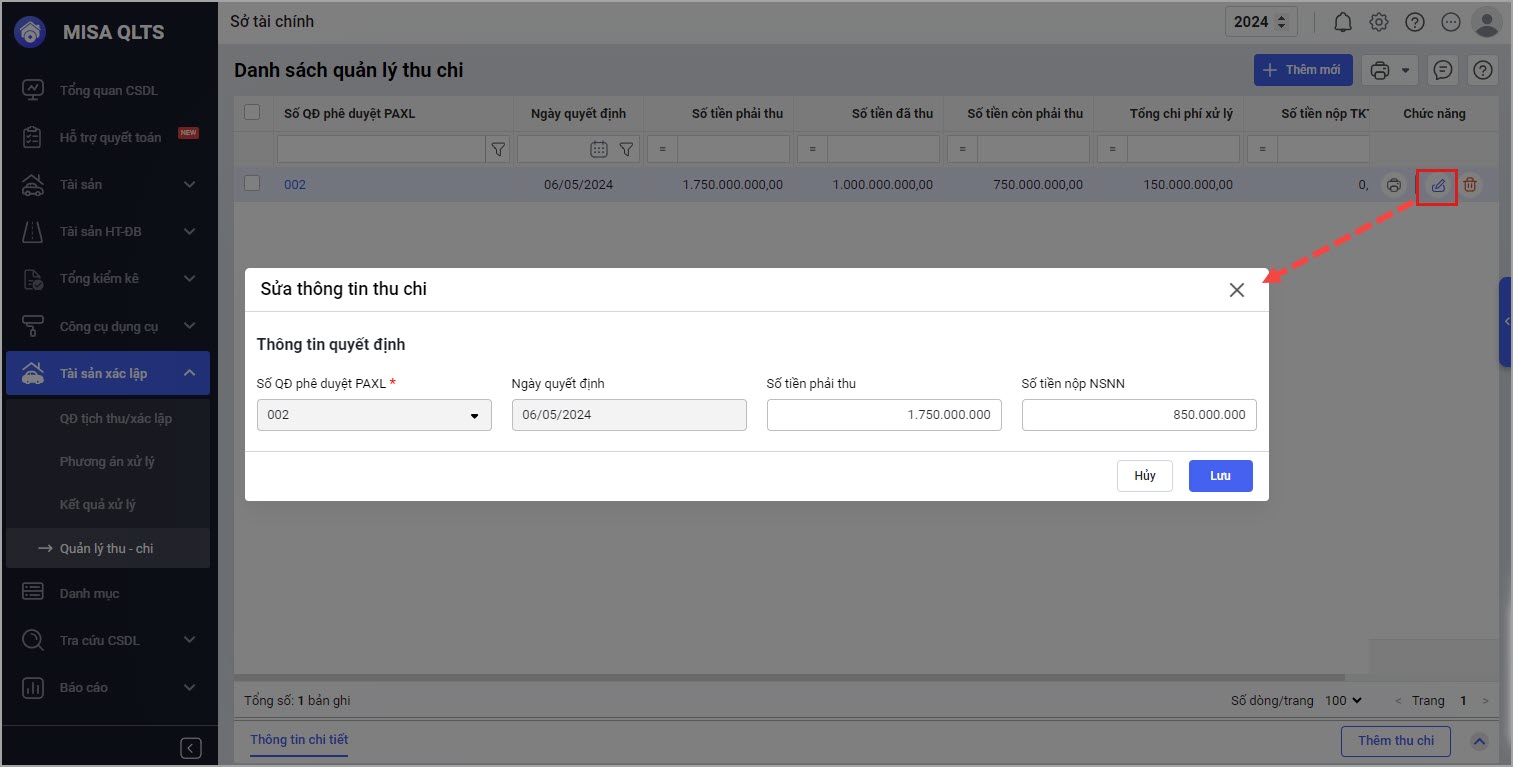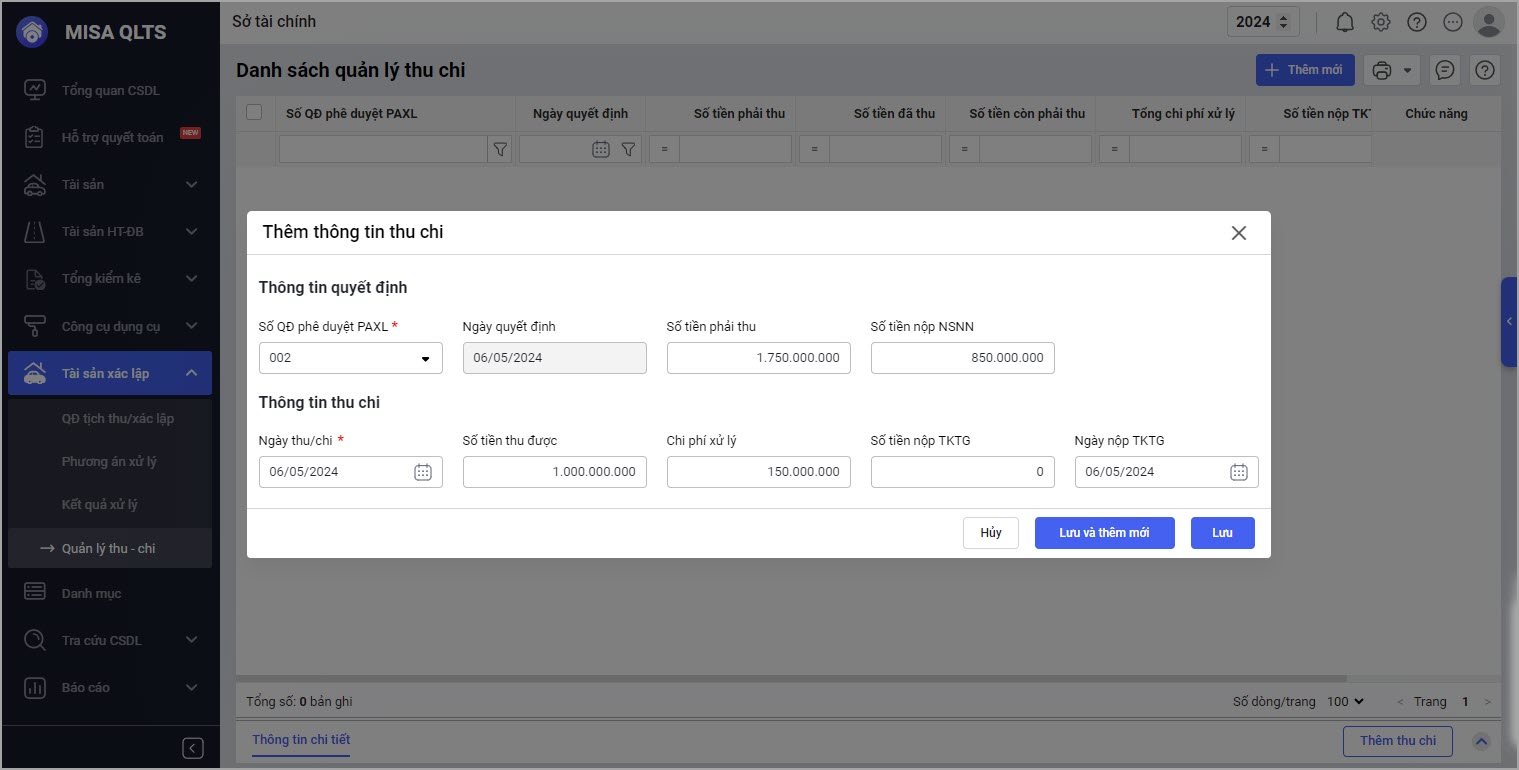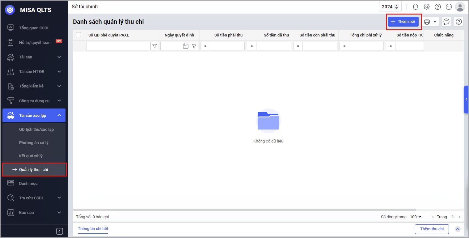 Bước 1: Tại menu Tài sản xác lập\Quản lý thu – chi, chọn Thêm mới.