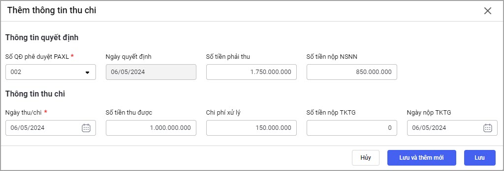 Bước 3: Nhấn Lưu để lưu thông tin hoặc Lưu và thêm mới để tiếp tục thêm thông tin thu – chi mới.