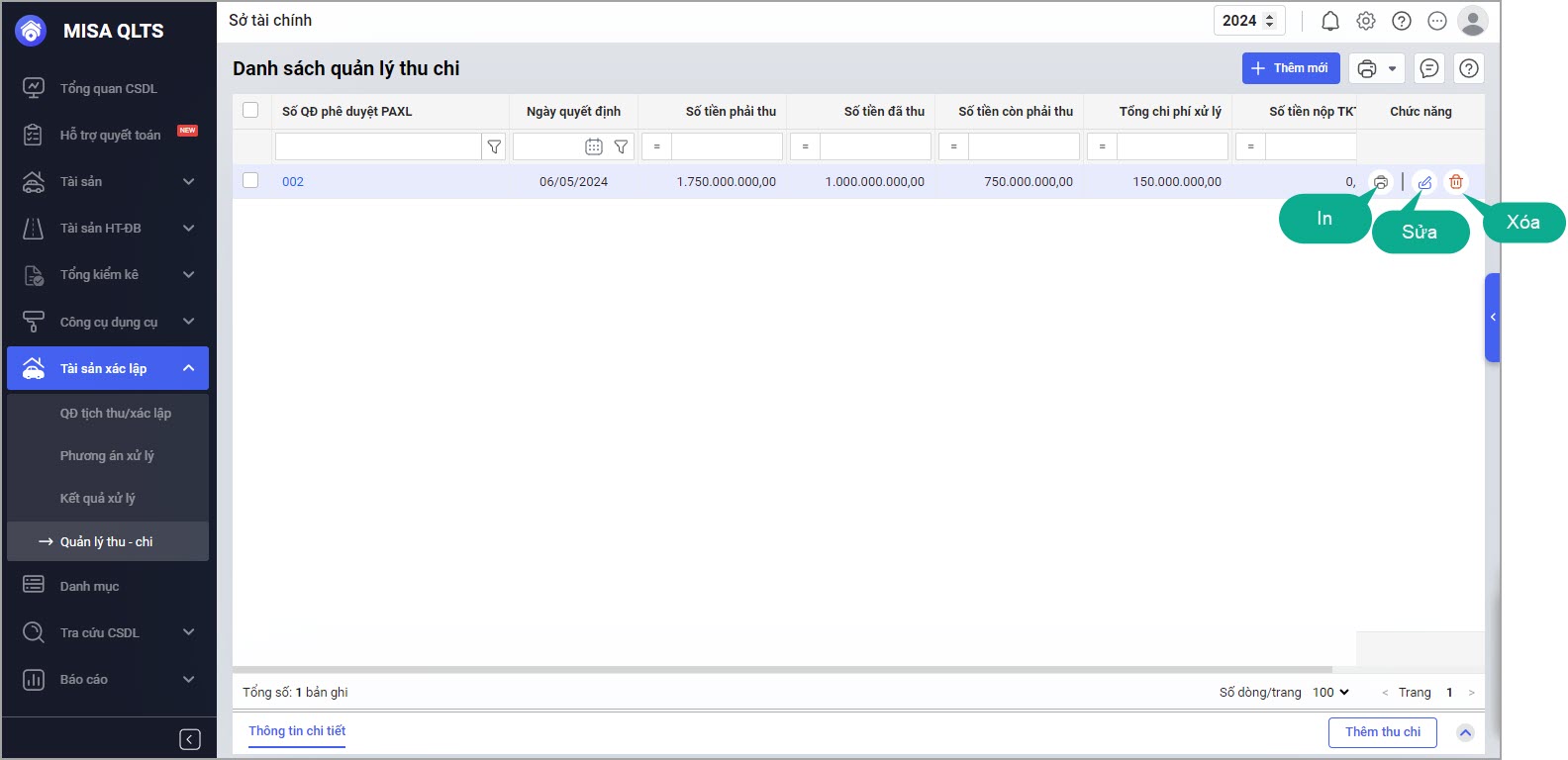 Bước 4: Các ghi chép thu – chi đã được cập nhật sẽ hiển thị tại Danh sách quản lý thu – chi. Anh/chị có thể In, Sửa, Xóa bằng cách nhấn vào nút chức năng tương ứng.