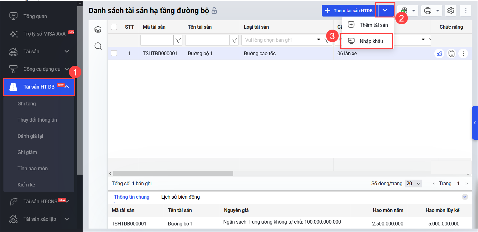 Bước 1: Vào menu Tài sản HT-ĐB, nhấn nút mũi tên cạnh nút Thêm tài sản HTĐB, chọn Nhập khẩu.