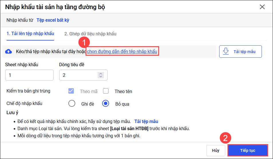 Bước 2: Thực hiện chọn đến file excel đơn vị bị sáp nhập gửi\nhấn Tiếp tục.