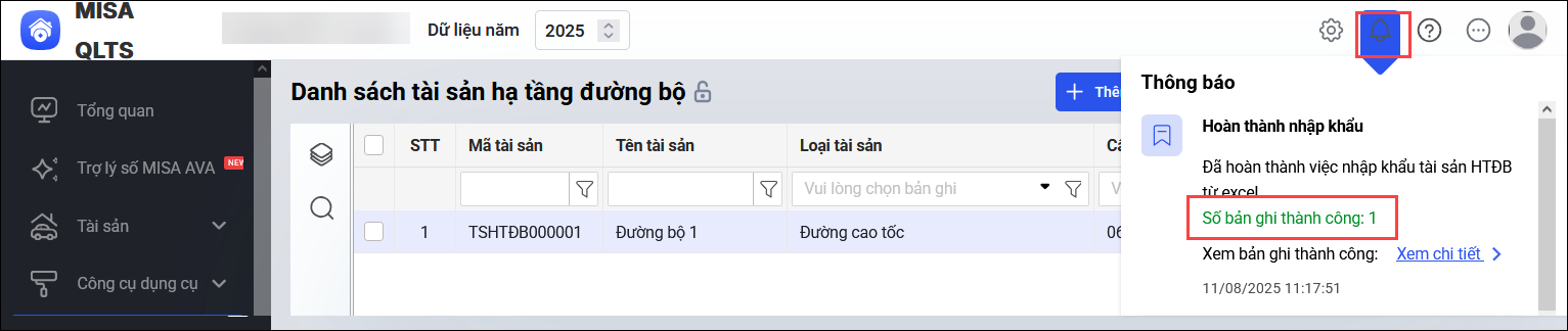 Bước 4: Bạn nhấn vào thông báo (hình quả chuông) để kiểm tra lại danh sách tài sản đã nhập khẩu thành công hay không thành công. Nếu không thành công thực hiện Tải danh sách lỗi, sửa lại file và nhập khẩu lại.