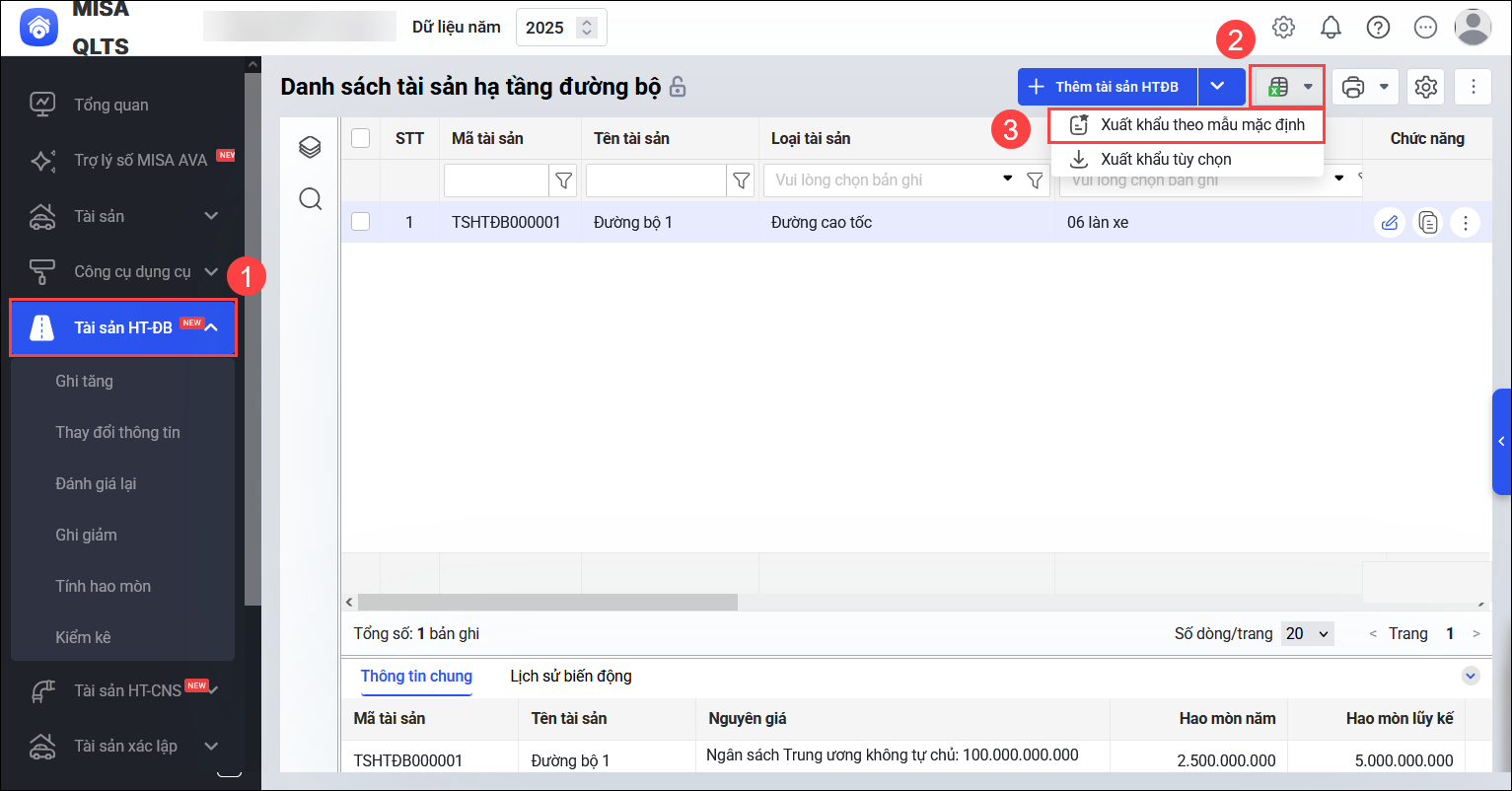 • Vào menu Tài sản HT-ĐB, nhấn Xuất khẩu, chọn tính năng Xuất khẩu theo mẫu mặc định.