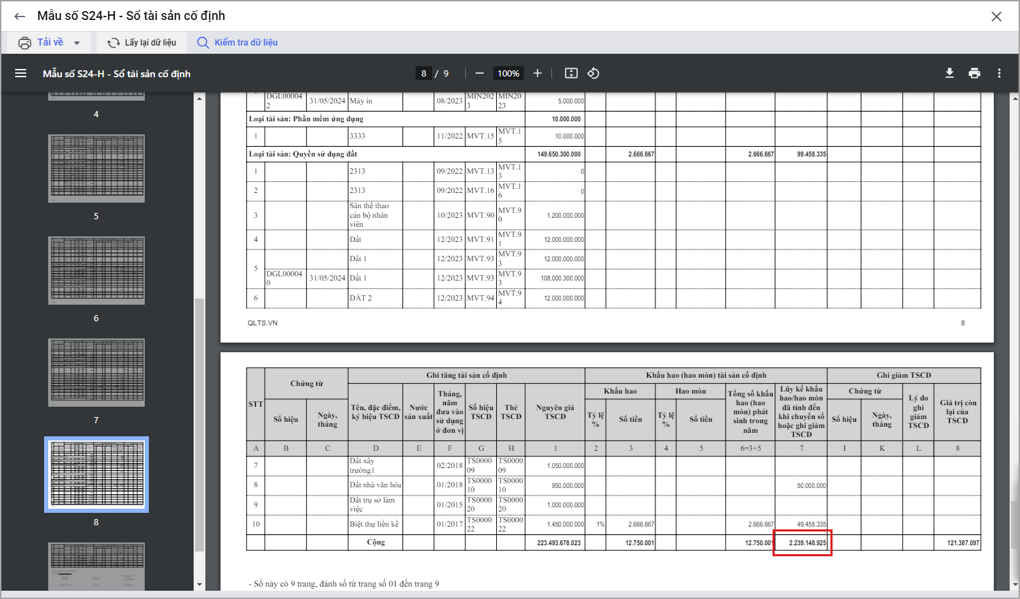 - Hao mòn lũy kế trên S24-H: Sổ TSCĐ là 2.239.148.925đ