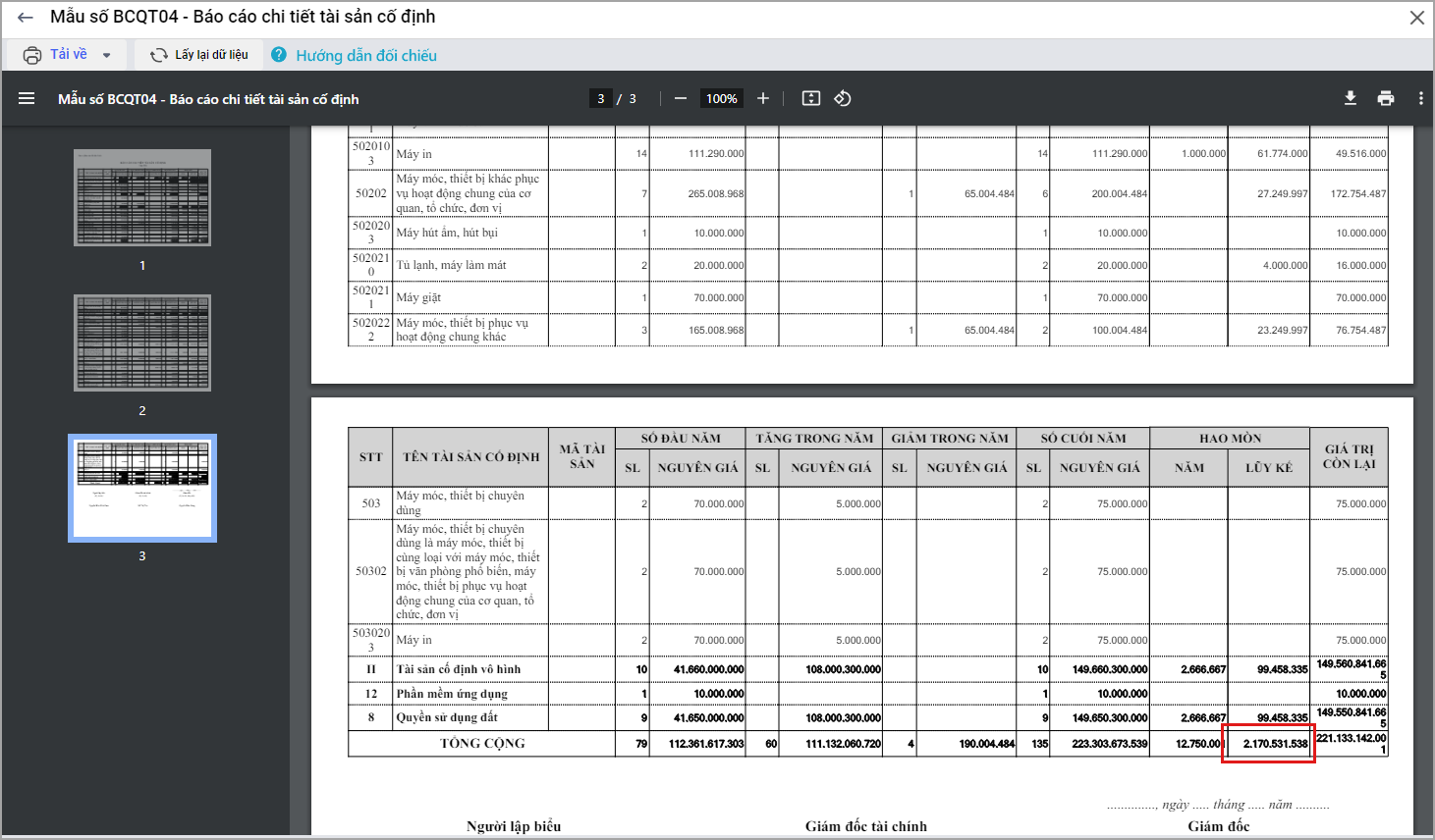 - Nhưng Hao mòn lũy kế trên Báo cáo chi tiết tài sản cố định là 2.170.531.538đ