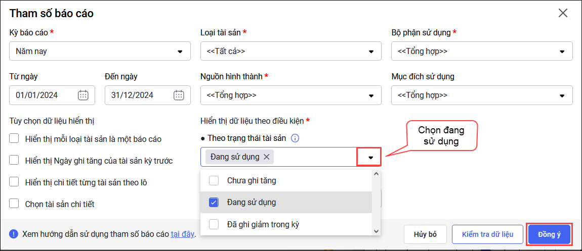 - Khi in báo cáo S24-H chọn tham số Theo trạng thái tài sản tích chọn “Đang sử dụng”. Nhấn Đồng ý