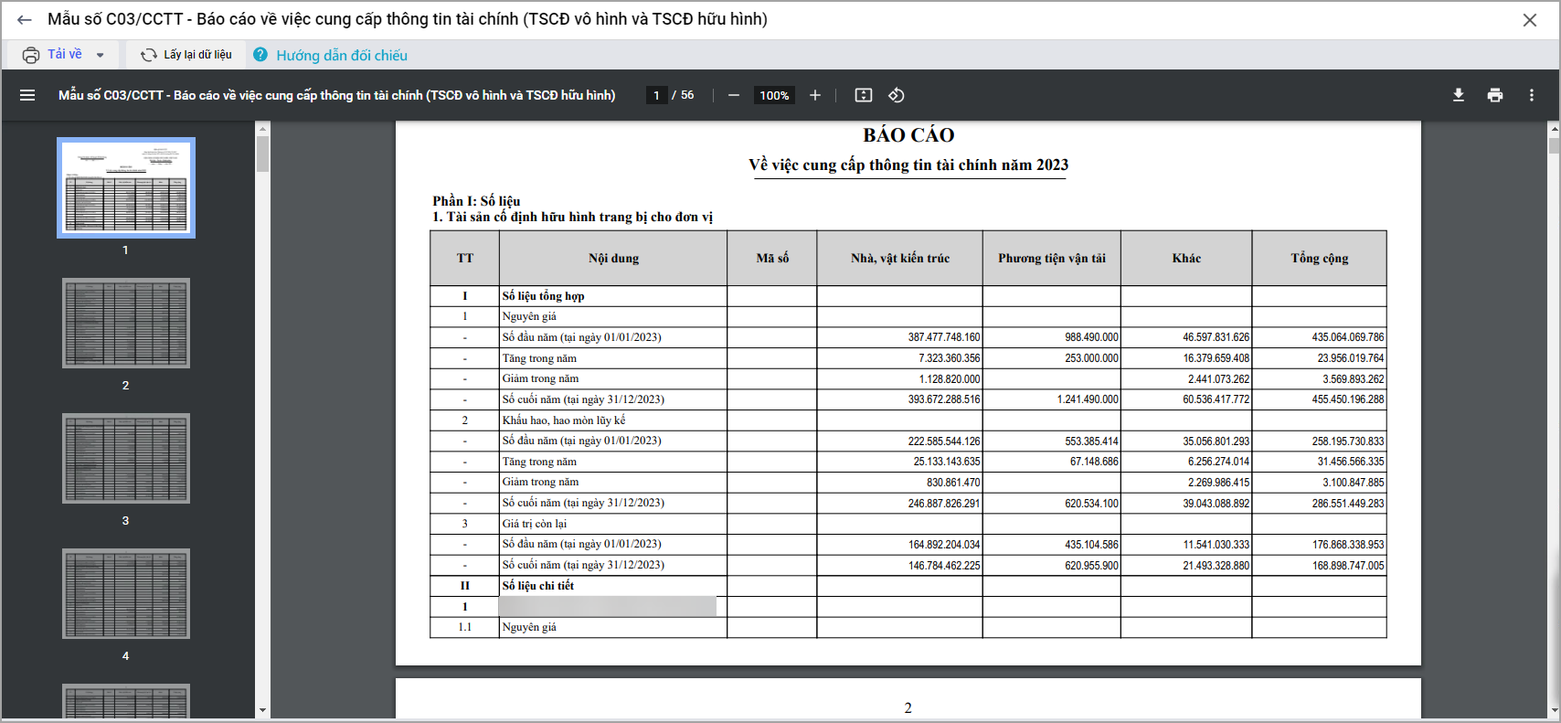 Phần mềm cho phép cập nhật TT23/2023/TT-BTC, sau đó chuyển loại tài sản từ loại IV. TSCĐ đặc thù sang loại I. TSCĐ đặc thù. Khi in báo cáo C03 tại tham số báo cáo nếu chọn Tổng hợp chung thì thấy bị lệch số đầu năm 2023 và số cuối năm 2022