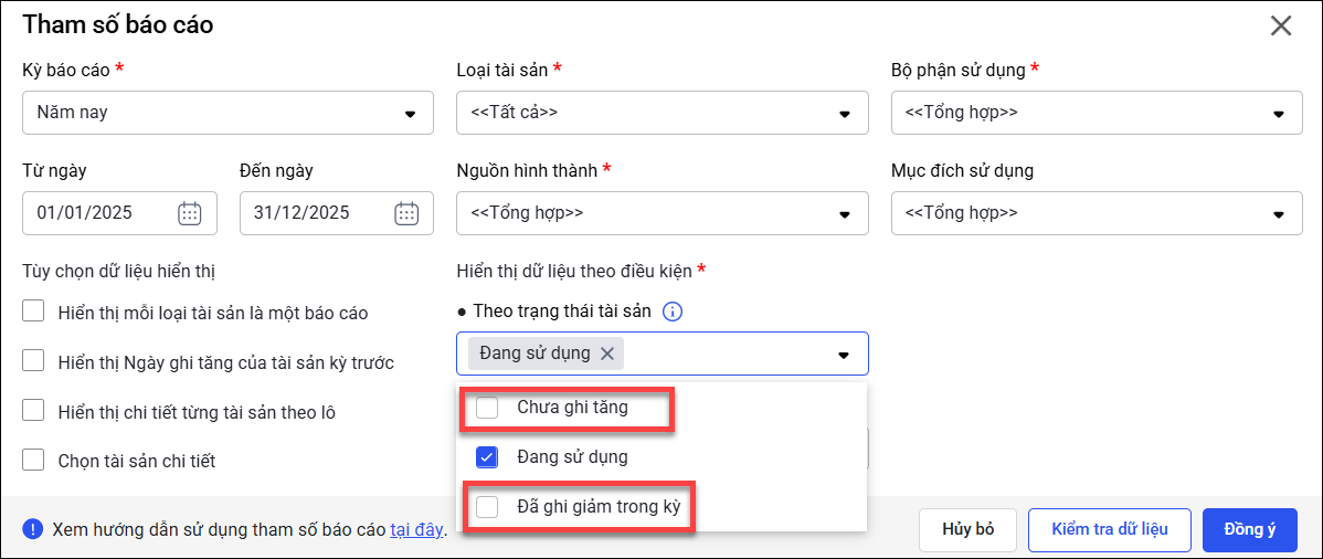 - Nếu muốn khớp, anh/chị bỏ tích chọn Đã ghi giảm trong kỳ và bỏ tích Chưa ghi tăng khi chọn tham số Theo trạng thái tài sản của báo cáo của mẫu S24-H.