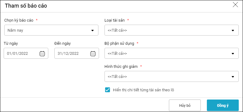 • Hiển thị chi tiết từng tài sản theo lô: Tích chọn nếu muốn hiển thị chi tiết các tài sản trong lô tài sản.
