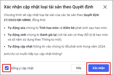 • Tích chọn Đồng ý cập nhật và chọn Xác nhận để đồng ý cập nhật tài sản theo thông tư mới.