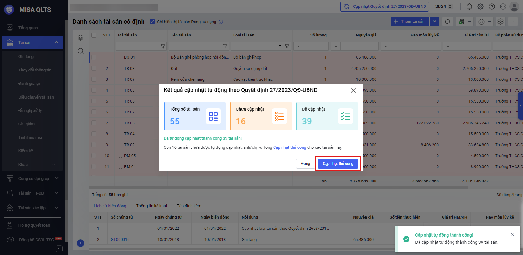 Bước 3. Phần mềm hiển thị tổng số tài sản đã cập nhật, tổng số tài sản chưa được cập nhật. Với các tài sản chưa được cập nhật anh/chị có thể cập nhật thủ công bằng cách chọn Cập nhật thủ công anh/chị xem hướng dẫn Cập nhật thủ công tương tự tại đây.