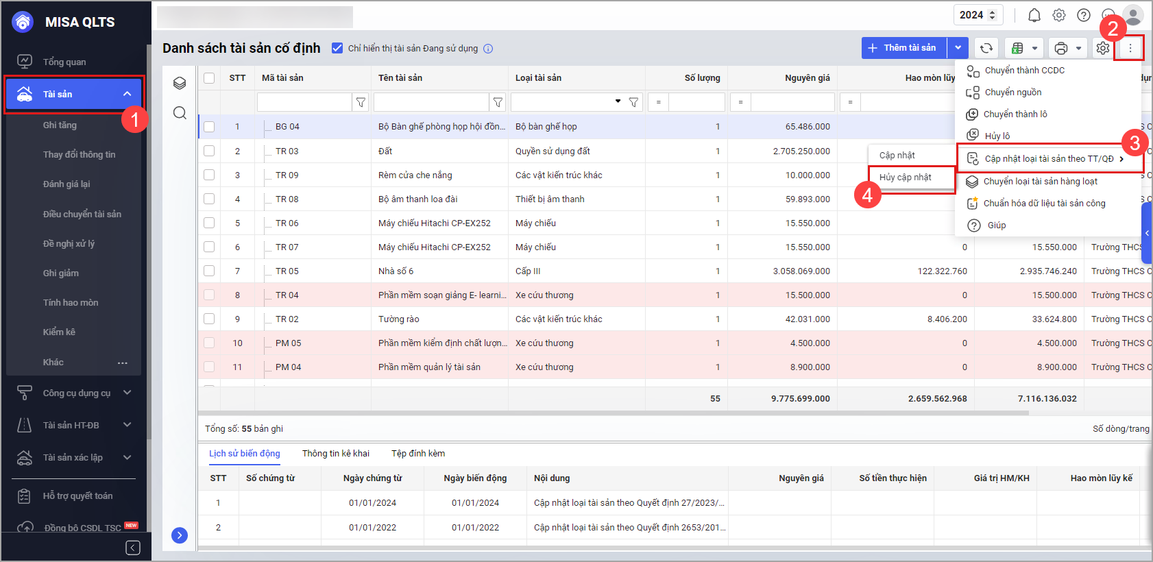 Trong trường hợp thực hiện cập nhật tài sản theo Quyết định số 27/2023/QĐ-UBND có sai sót, tính năng Hủy bỏ chuyển loại tài sản sẽ giúp lấy lại thông tin của tài sản tại thời điểm trước khi cập nhật.