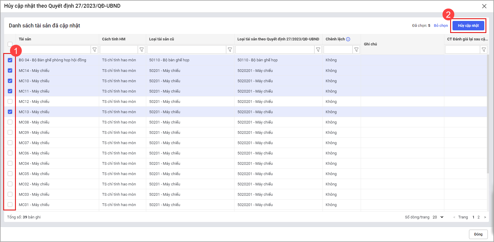• Phần mềm sẽ hiển thị lên danh sách hủy chuyển đổi, tích chọn tài sản và nhấn Hủy cập nhật.