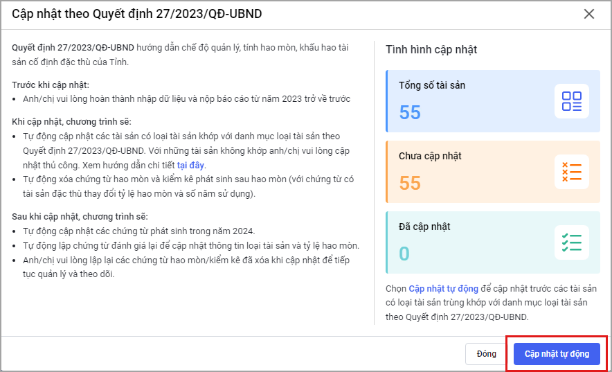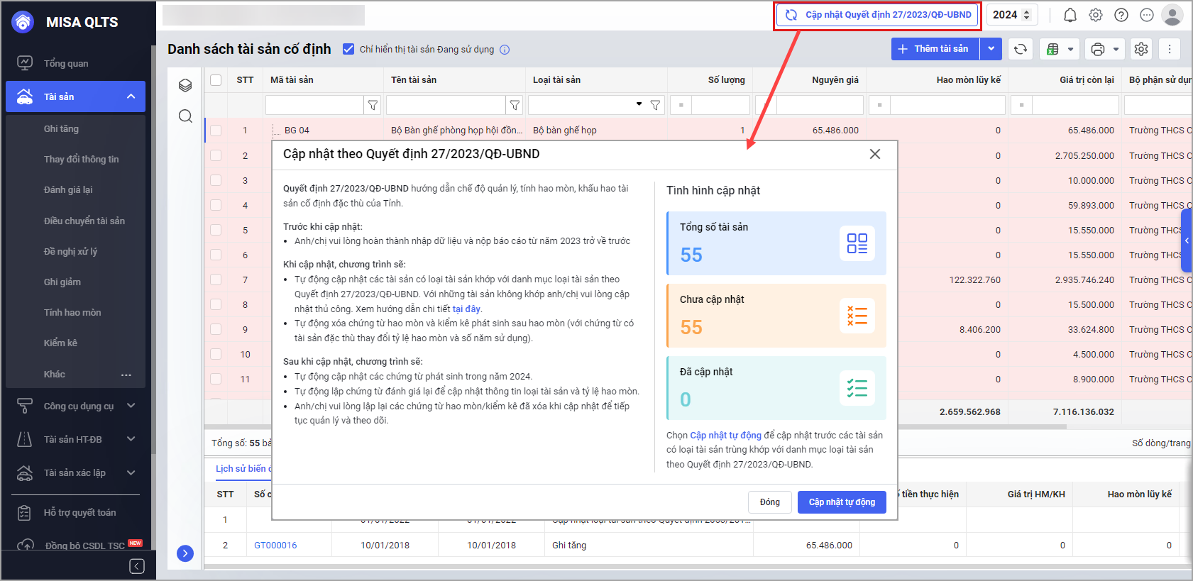 • Hoặc tại màn hình Danh sách tài sản cố định chọn Cập nhật Quyết định số 27/2023/QĐ-UBND