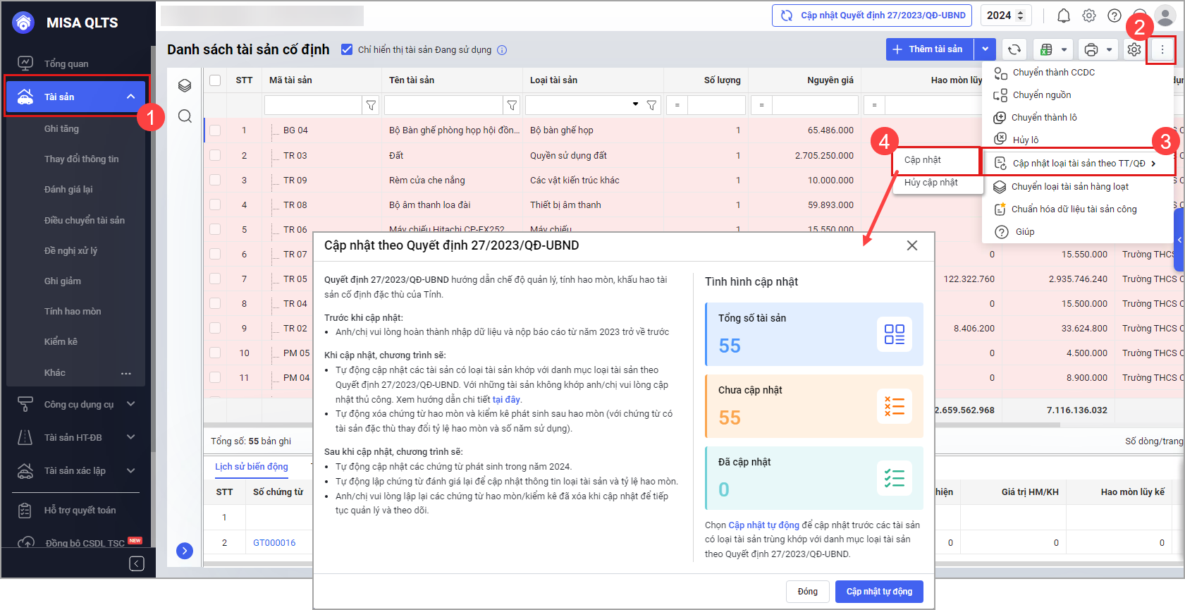 Tại màn hình Danh sách tài sản cố định, nhấn vào biểu tượng dấu ba chấm, chọn Cập nhật loại tài sản theo thông tư, sau đó chọn Cập nhật để cập nhật Quyết định số 27/2023/QĐ-UBND.