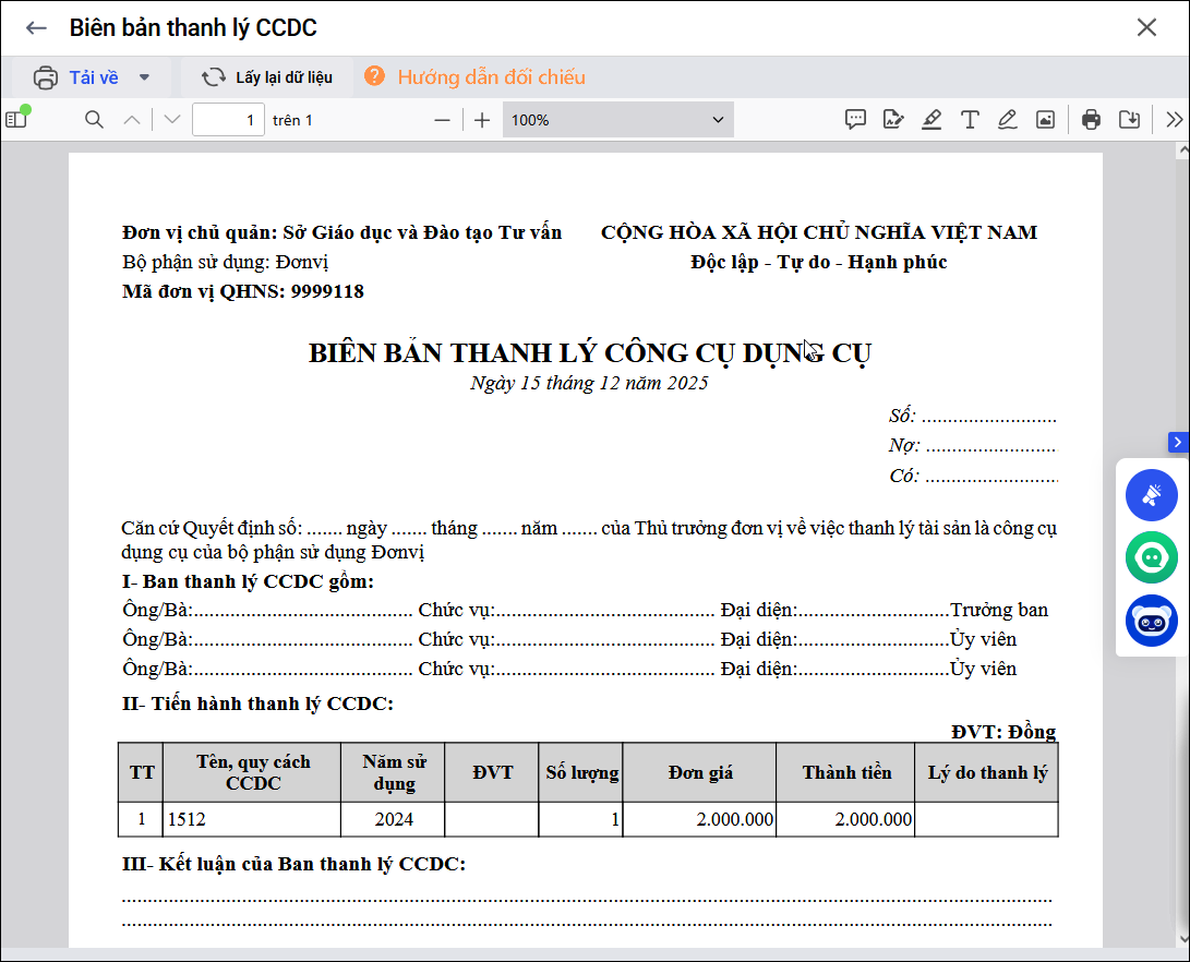 Bước 4: Nhấn Lưu chứng từ. Thực hiện in lại Biên bản thanh lý CCDC sẽ hiển thị đầy đủ số liệu.