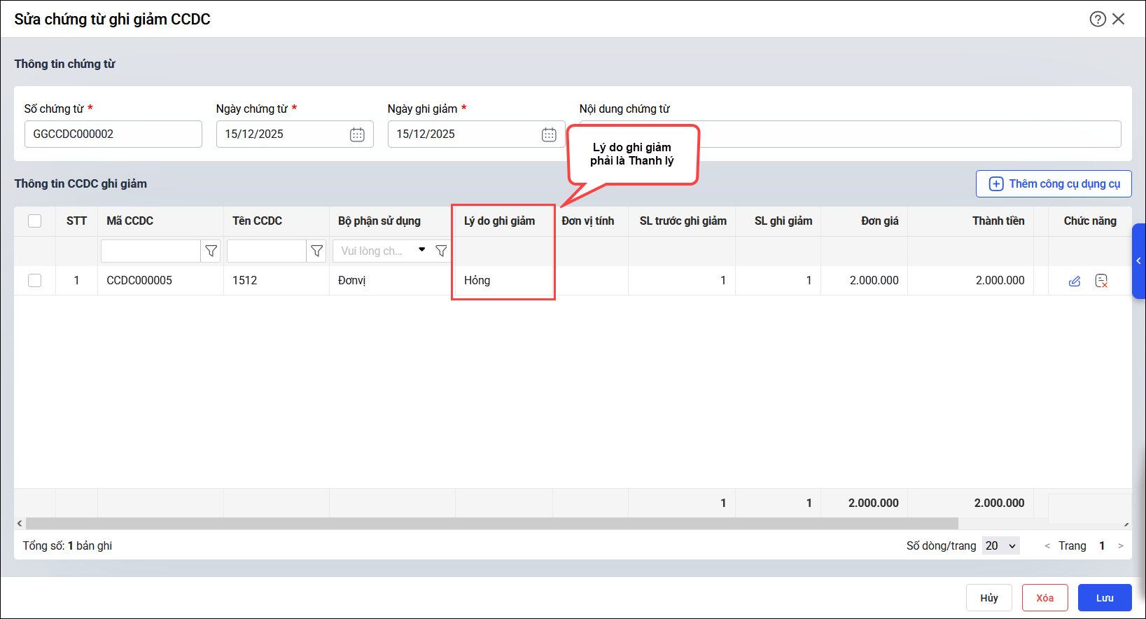 Bài viết hướng dẫn xác định nguyên nhân và cách khắc phục tình trạng biên bản thanh lý CCDC không hiển thị số liệu sau khi đã ghi giảm trên phân hệ CCDC.