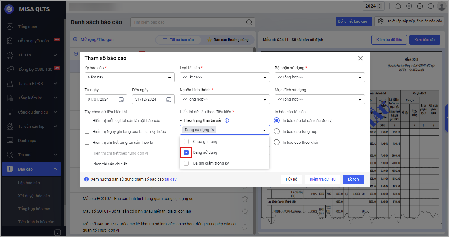 Giải pháp: Để số liệu của báo cáo S24 – H: Sổ TSCĐ trên MISA QLTS bằng với số liệu trên S05 – H: Bảng kê phát sinh trên Mimosa Online thì khi chọn tham số báo cáo S24 – H anh/chị chọn trạng thái tài sản là Đang sử dụng trên tham số báo cáo.