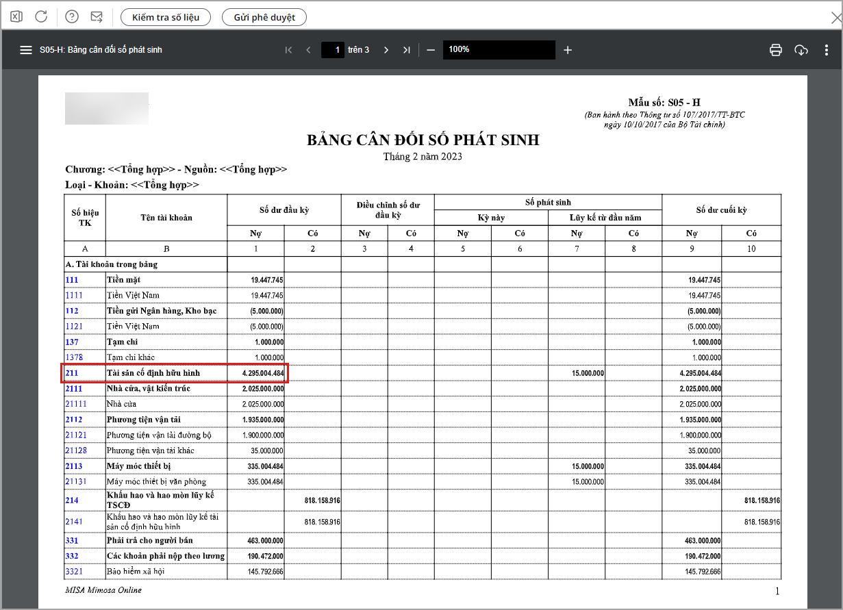 2. Tại sao khi đối chiếu Sổ tài sản cố định S24 – H: Sổ TSCĐ trên phần mềm MISA QLTS với báo cáo S05 – H: Bảng cân đối phát sinh trên Mimosa Online thấy số liệu không khớp nhau?