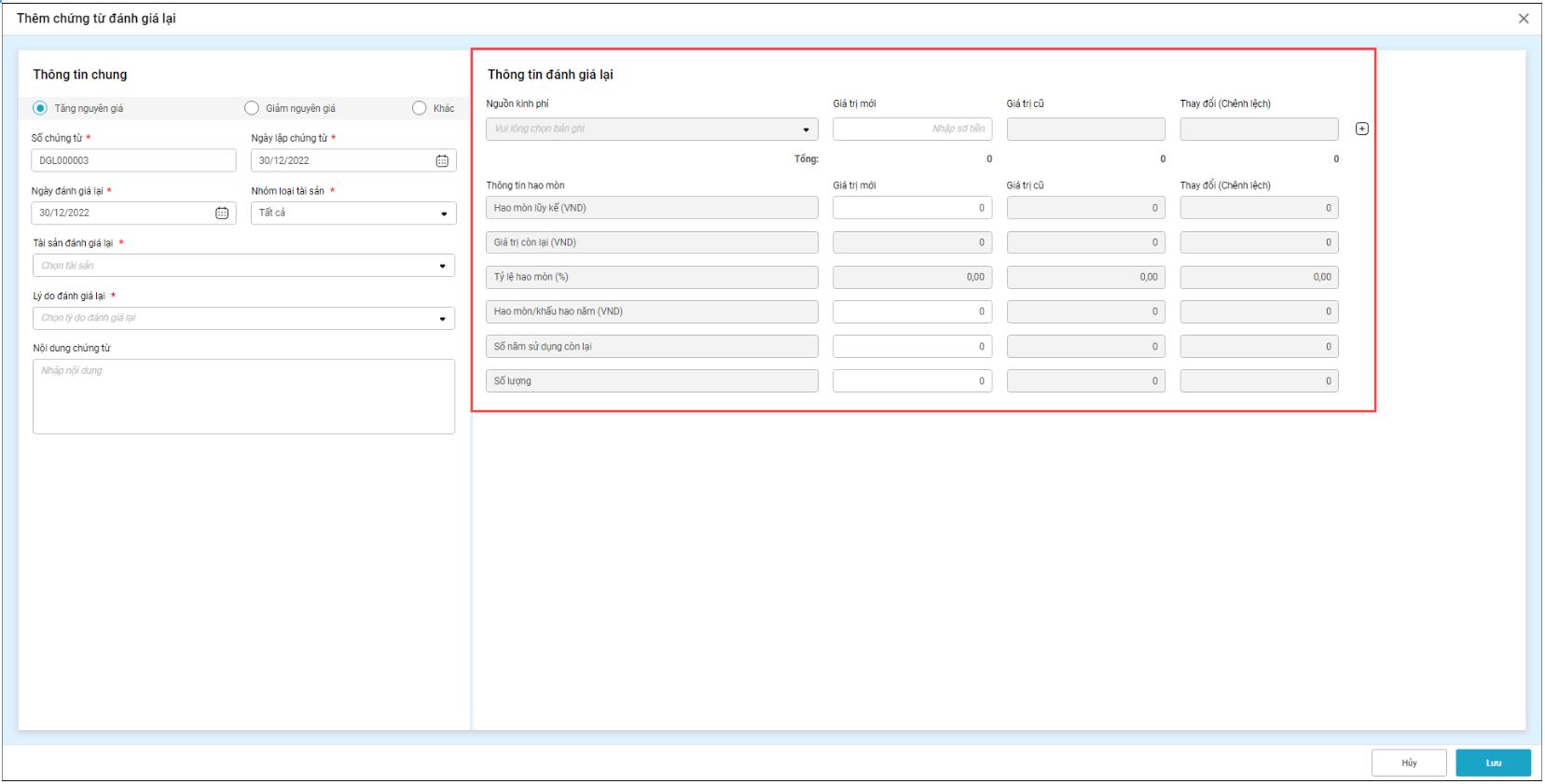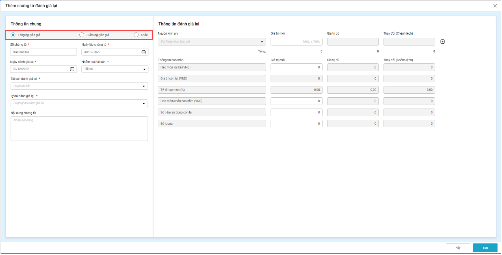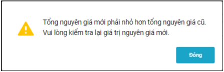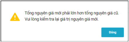 Khi chọn Tăng nguyên giá, sau khi khai báo các thông tin và giá trị mới, tổng nguyên giá mới phải lớn hơn tổng nguyên giá cũ mới có thể lưu chứng từ; nếu tổng nguyên giá mới nhỏ hơn, phần mềm sẽ hiển thị cảnh báo.